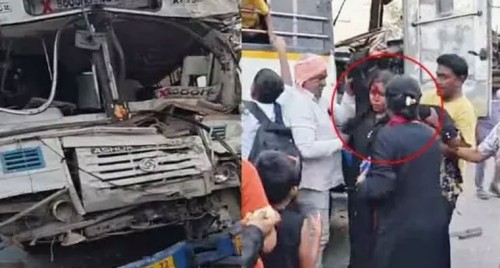 లారీని ఢీకొట్టిన కరీంనగర్ ఆర్టీసీ బస్సు